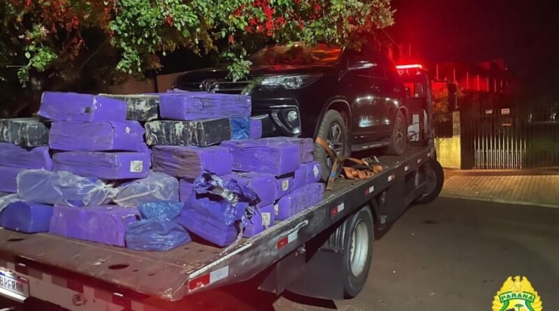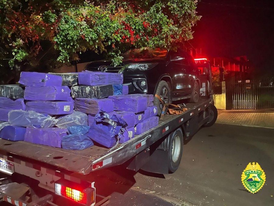 Após vários minutos de diligências, a equipe logrou êxito ao encontrar a Toyota SW4 em um terreno cercado por muro alto. O veículo estava carregado com diversos fardos de maconha.