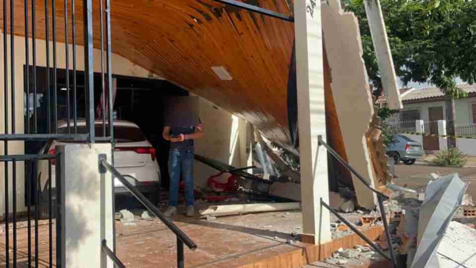 De acordo com a polícia, carro e motocicleta seguiam no mesmo sentido no momento da colisão. O impacto foi tão forte que o veículo subiu três degraus da mercearia, arrancou uma coluna e parte da cobertura do imóvel.