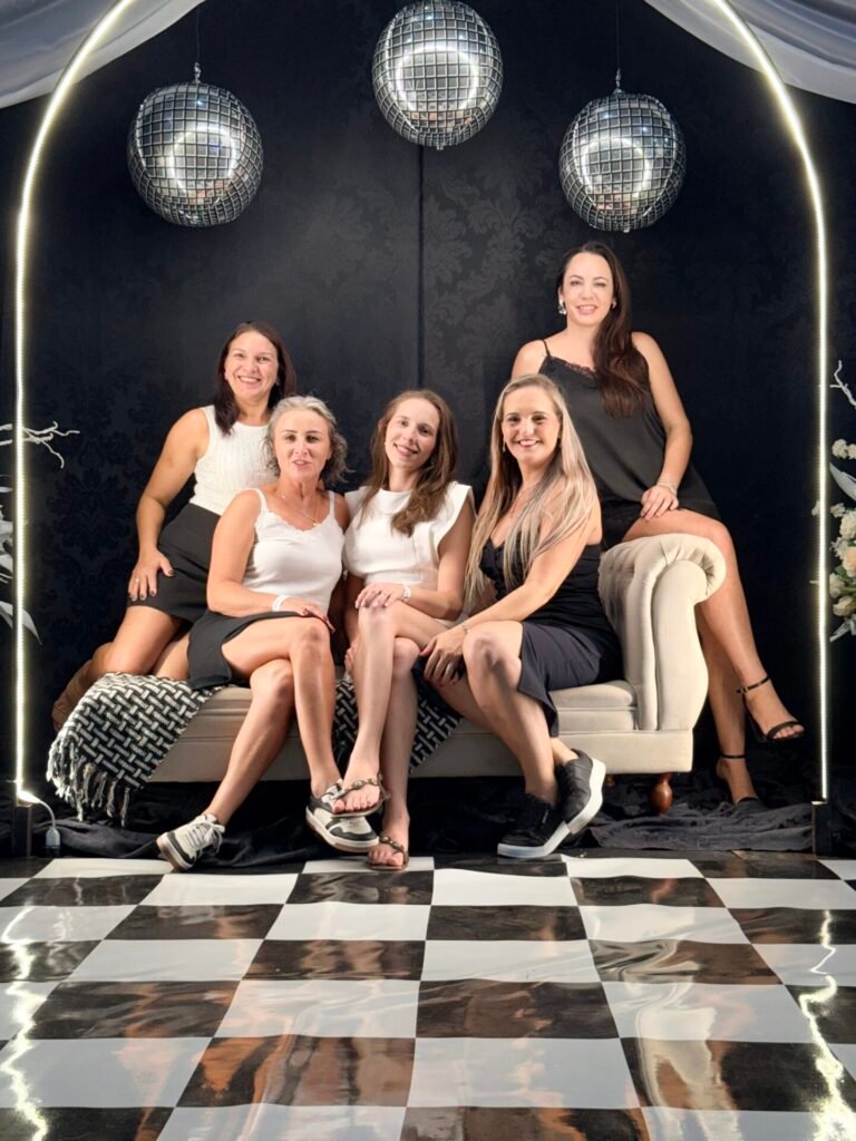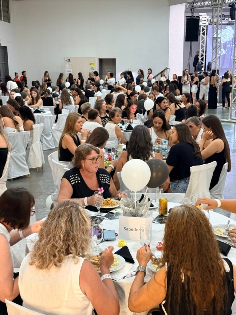 A ambientação do evento foi preparada com decoração nas cores preto e branco, temática que também orientou o traje das participantes, que marcaram presença vestindo roupas nas mesmas tonalidades, contribuindo para a identidade visual da noite.