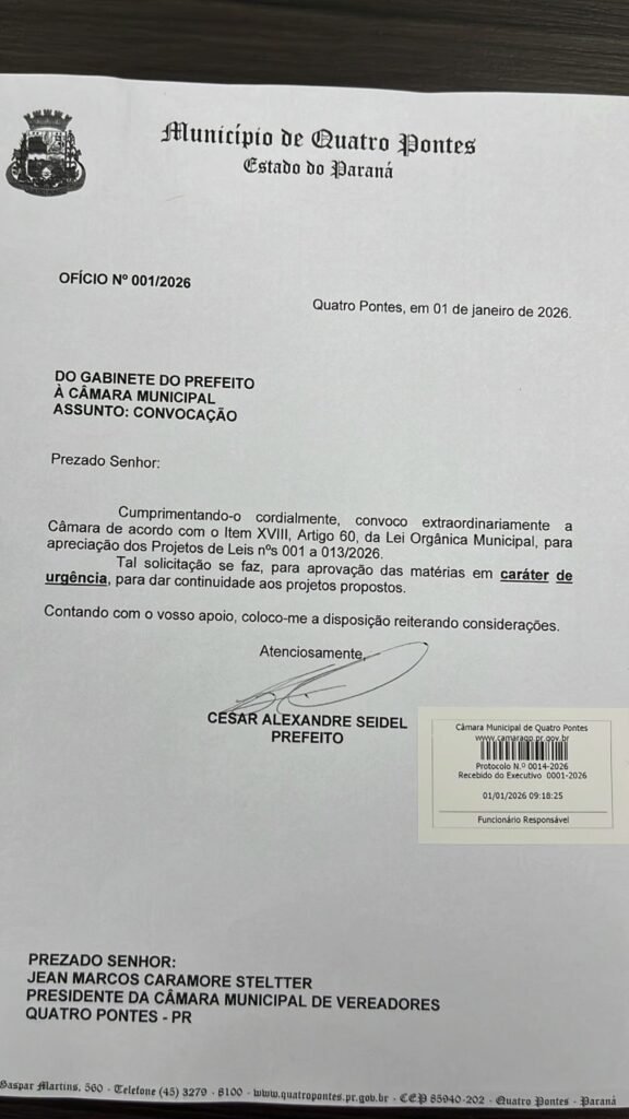 A reunião também marcou o protocolo oficial do Ofício nº 001/2026, por meio do qual o Executivo solicita a apreciação das matérias em caráter de urgência, a fim de garantir a continuidade dos projetos e o adequado andamento das ações planejadas para o município.