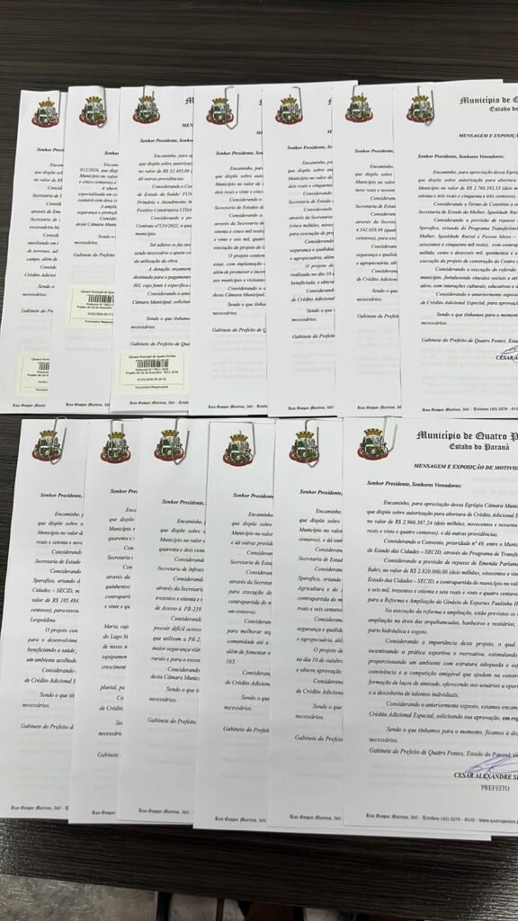 Os projetos agora seguem para análise e deliberação dos vereadores na Câmara Municipal de Quatro Pontes.