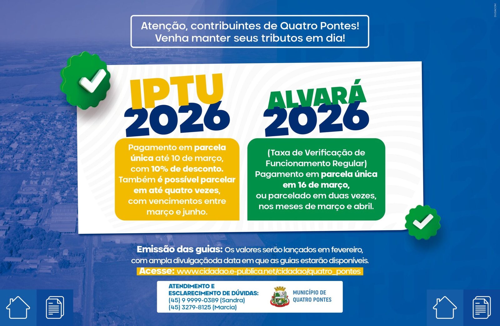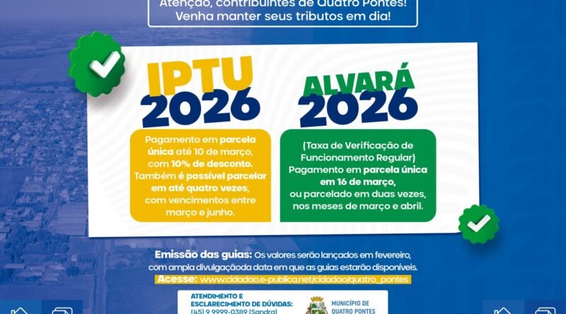 Prefeitura de Quatro Pontes divulga prazos para pagamento do IPTU e Alvará referentes ao exercício de 2026