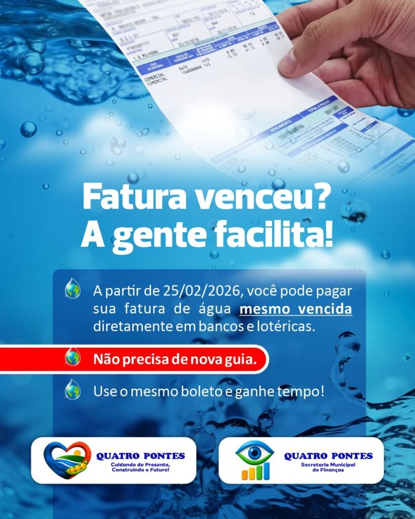 A Prefeitura de Quatro Pontes, por meio da Secretaria Municipal de Planejamento e Finanças, informa à população que, a partir 25 de fevereiro de 2026, as faturas de água podem ser quitadas mesmo após a data de vencimento, sem a necessidade de emissão de segunda via ou solicitação de nova guia junto à Prefeitura.