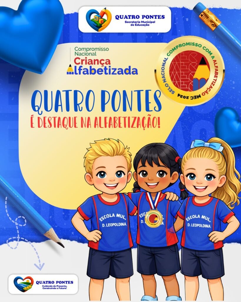 O município de Quatro Pontes conquistou o Selo Ouro no Selo Nacional Compromisso com a Alfabetização – Edição 2025, reconhecimento concedido pelo Ministério da Educação (MEC) às redes públicas que demonstram excelência na alfabetização das crianças na idade certa.