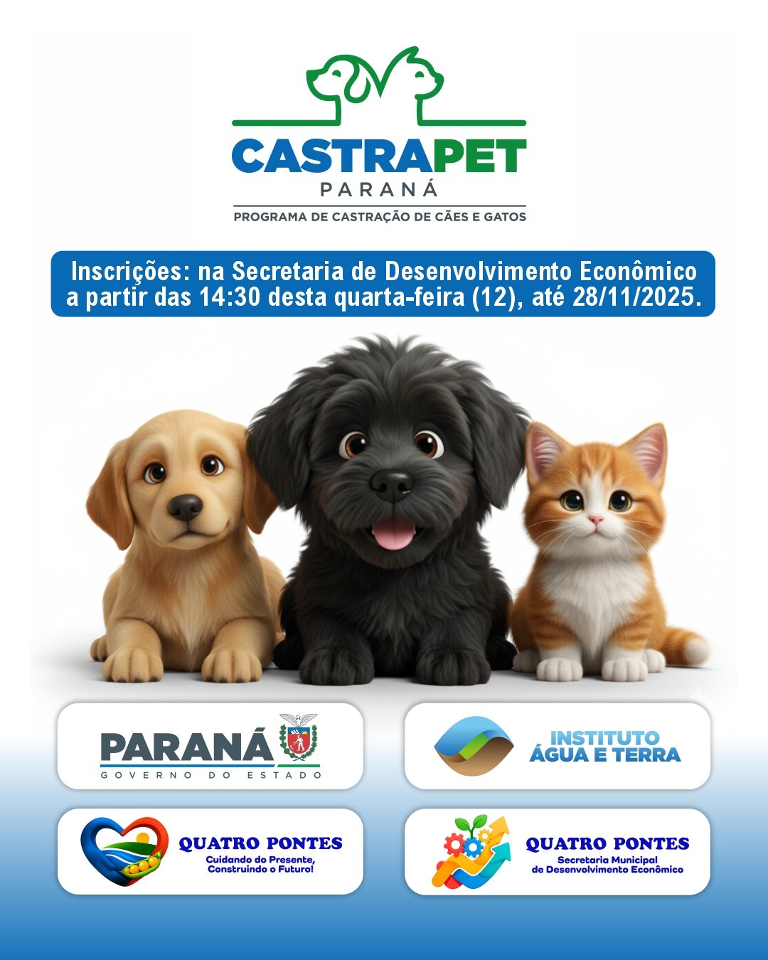 A Prefeitura de Quatro Pontes, por meio da Secretaria de Desenvolvimento Econômico, informa que as inscrições para o CastraPet-PR terão início na tarde desta quarta-feira, 12 de novembro de 2025, a partir das 14h30, na própria secretaria, com o médico veterinário Ricardo.