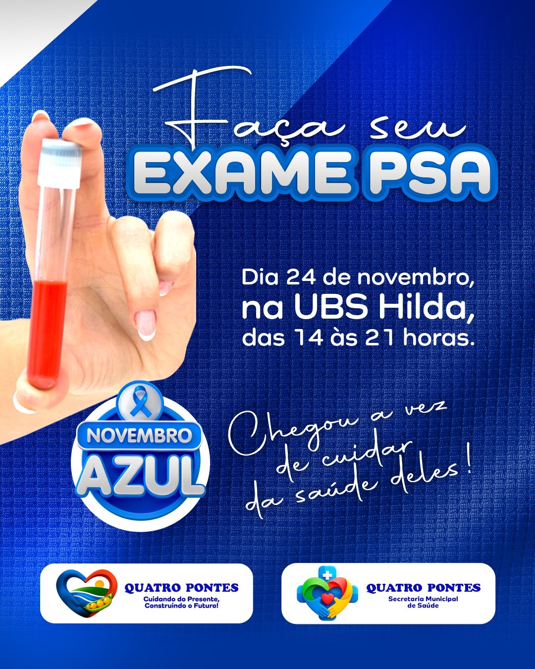 A Secretaria Municipal de Saúde informa que a Unidade Básica de Saúde Hilda realiza hoje, 24 de novembro, uma ação voltada à coleta de sangue para o exame PSA (Antígeno Prostático Específico), utilizado no rastreamento do câncer de próstata.