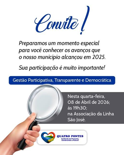 A prefeitura reforça o convite a todas as famílias da região da Linha São José para que compareçam e exerçam seu papel cidadão. Encontros como este são fundamentais para garantir que as políticas públicas atendam, de fato, às necessidades reais da população quatropontense.