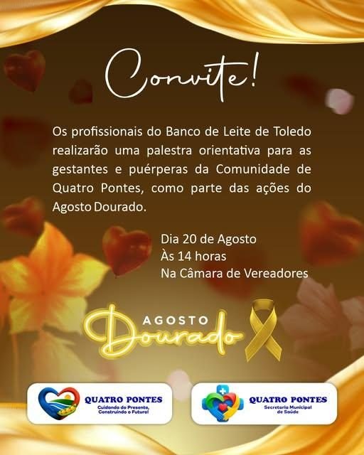 O município de Quatro Pontes promoverá nesta quarta-feira, dia 20 de agosto, às 14 horas, na Câmara de Vereadores, uma atividade especial em alusão ao Agosto Dourado, mês dedicado à conscientização sobre a importância do aleitamento materno.
