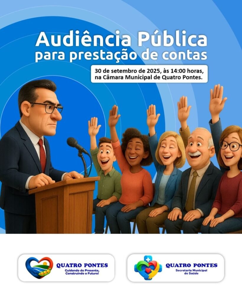 A Prefeitura de Quatro Pontes, por meio da Secretaria Municipal de Saúde, convida a população para acompanhar a Audiência Pública de Prestação de Contas referente ao 2º quadrimestre de 2025.