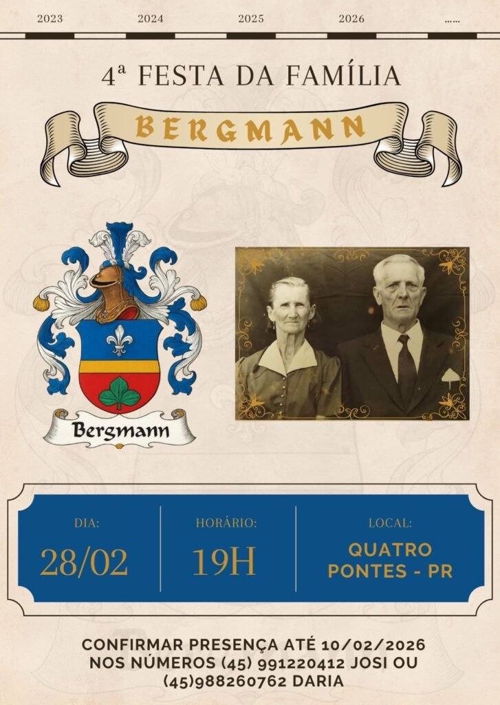 Neste ano, a quarta edição da festa acontece em Quatro Pontes, no Clube Cultural, na ala anexa à piscina, reunindo familiares vindos do Rio Grande do Sul e de Santa Catarina. O encontro promete momentos de confraternização, memória, música e celebração das raízes que mantêm a família Bergmann unida ao longo das gerações.