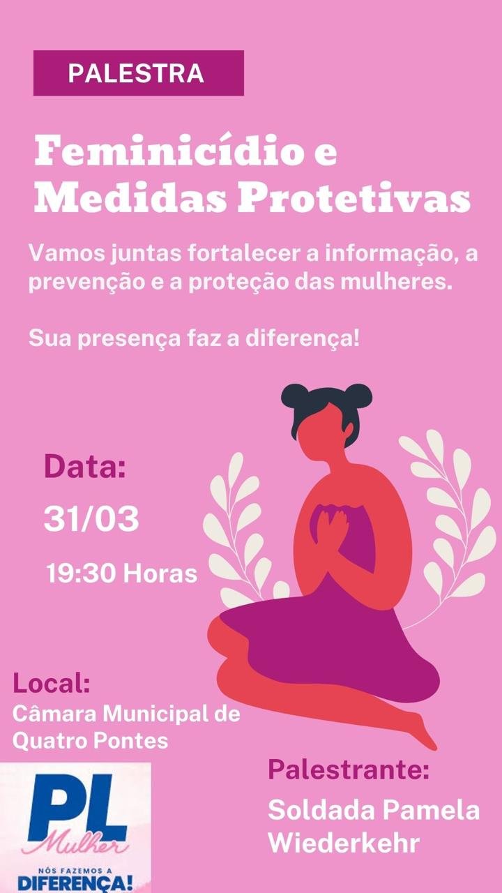 Em meio ao aumento dos casos de violência contra a mulher no país e dentro das ações alusivas ao mês da mulher, o PL Mulher de Quatro Pontes promove uma importante palestra com o tema “Feminicídio e Medidas Protetivas”. O encontro acontece no dia 31 de março, às 19h30, na Câmara Municipal de Quatro Pontes.