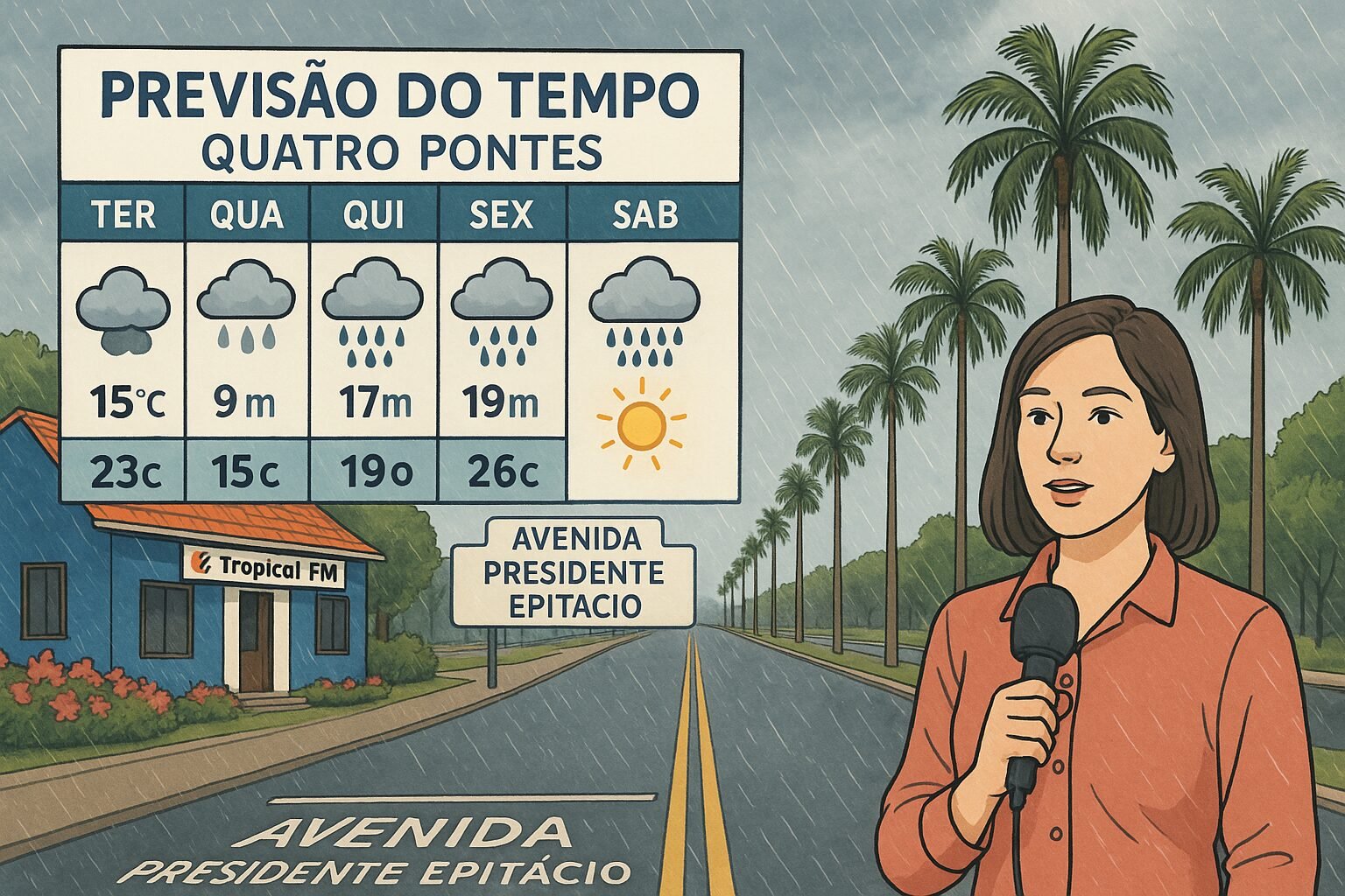 A terça-feira (7) amanheceu nublada em Quatro Pontes, com clima ameno e temperaturas variando entre 16 e 24 graus. De acordo com o site Foreca, o dia deve seguir sem chuva, mas com rajadas de vento chegando a 14 km/h.