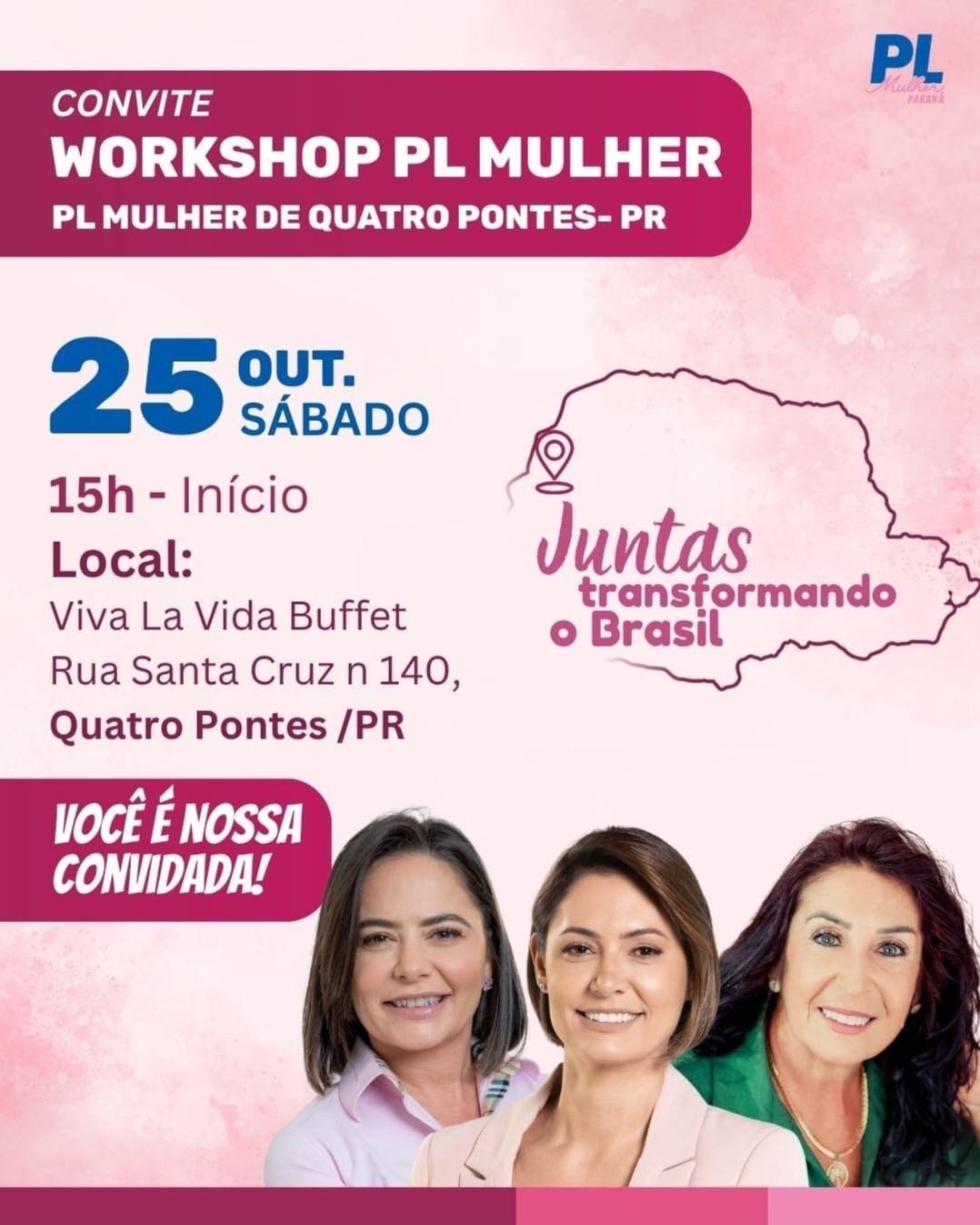 O Partido Liberal (PL) de Quatro Pontes realiza neste sábado, dia 25 de outubro, o Workshop PL Mulher, um encontro voltado à participação feminina na política e à formação da nova diretoria municipal do movimento. O evento acontece a partir das 15h, no Viva La Vida Buffet, localizado na Rua Santa Cruz, nº 140, em Quatro Pontes.
