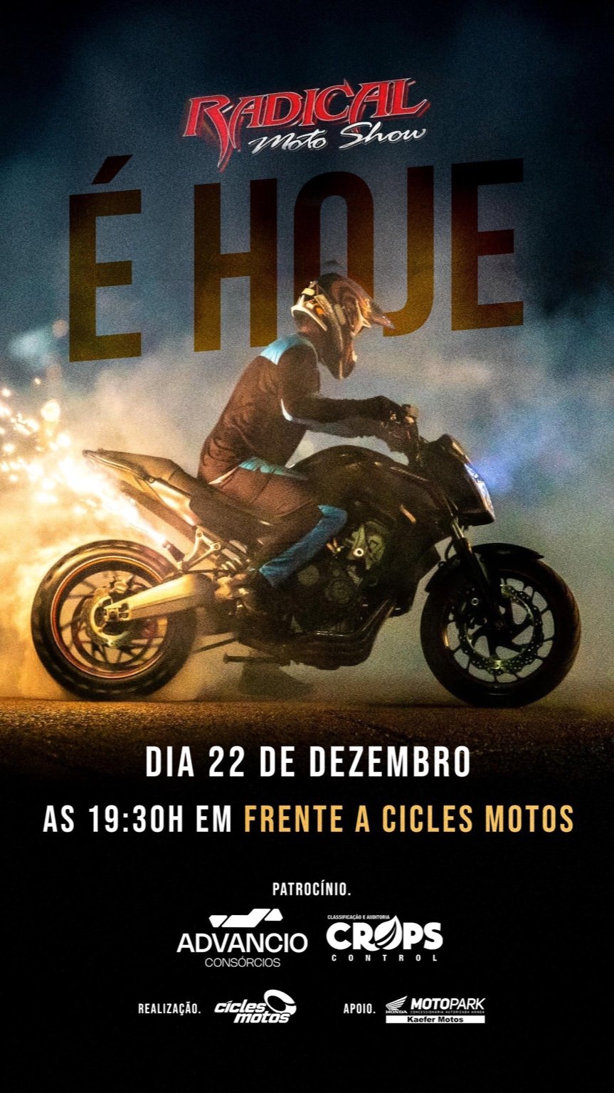 A noite desta segunda, 22 de dezembro, promete fortes emoções em Nova Santa Rosa. A partir das 19h30, em frente à Cicles Motos, acontece o show de motos com o Radical Moto Show.