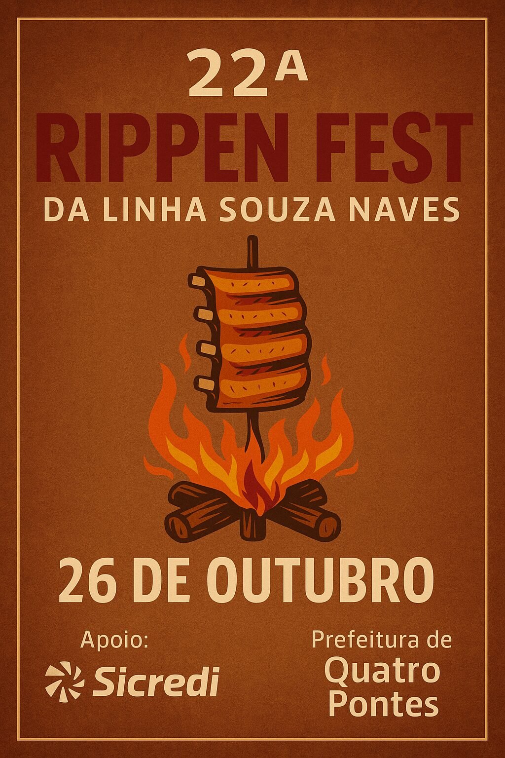 Uma das festas mais tradicionais e saborosas do interior de Quatro Pontes está de volta: a 22ª Rippen Fest da Linha Souza Naves, que acontece no dia 26 de outubro, promovida pela Associação de Moradores.