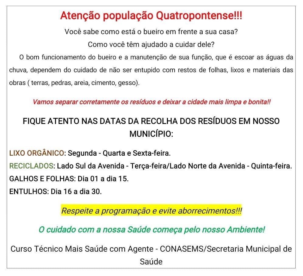 A Secretaria de Saúde reforça que respeitar a programação é essencial para evitar aborrecimentos e manter a cidade organizada. Além disso, lembra que o cuidado com o ambiente reflete diretamente na saúde da população.