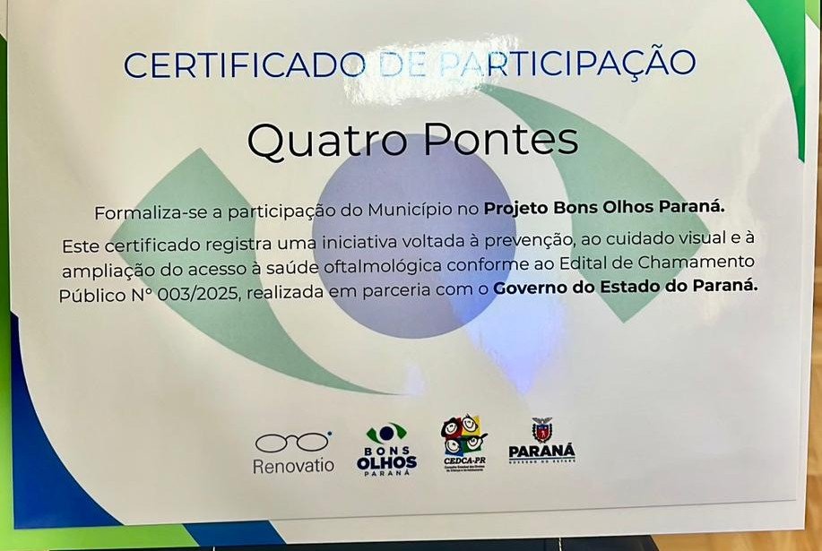 A Secretaria Municipal de Desenvolvimento Social de Quatro Pontes formalizou a adesão do município ao Programa Bons Olhos Paraná, iniciativa do Governo do Estado, coordenada pela Secretaria de Estado do Desenvolvimento Social e Família (SEDEF), voltada à promoção da saúde ocular de crianças e adolescentes da rede pública de ensino.