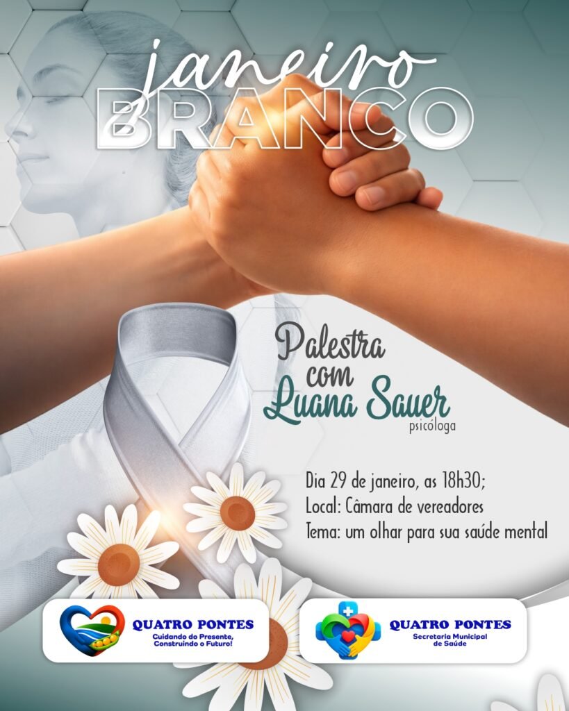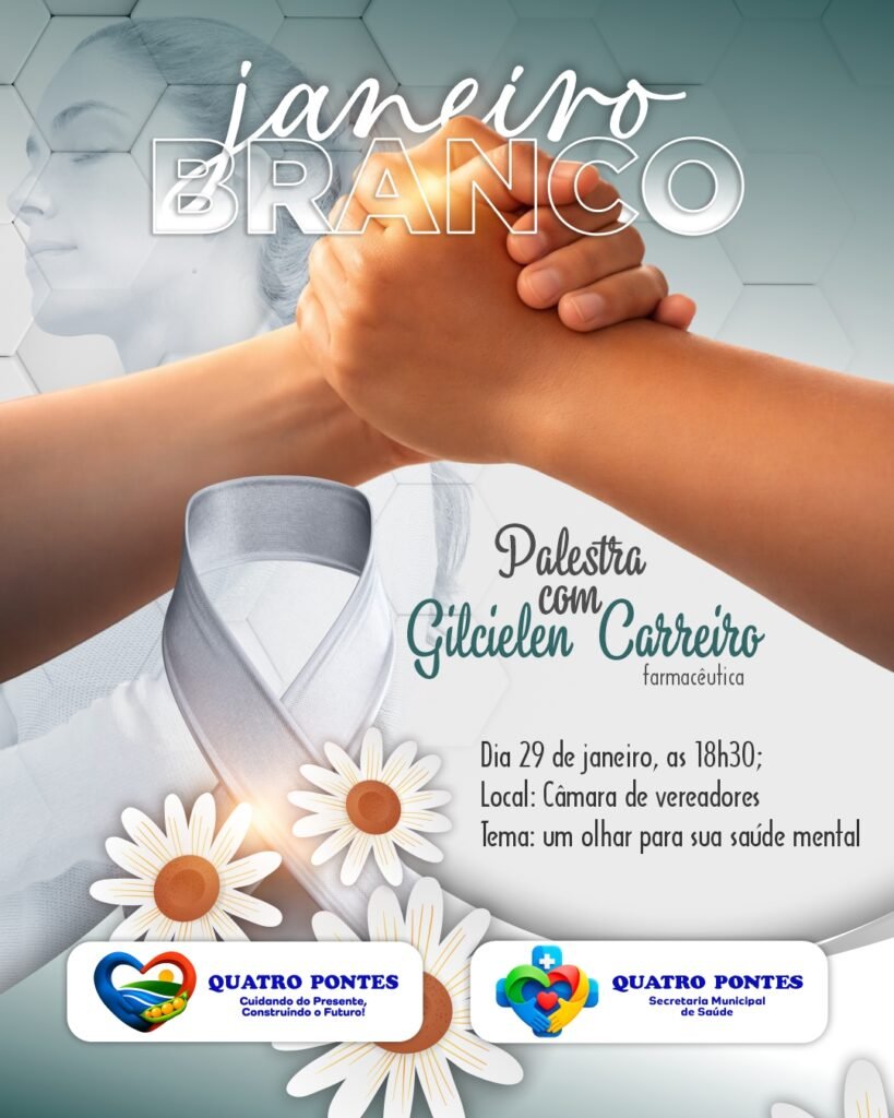 A Prefeitura de Quatro Pontes, por meio da Secretaria Municipal de Saúde, realiza duas palestras em alusão à campanha Janeiro Branco, iniciativa nacional dedicada à promoção da saúde mental e emocional, com foco na conscientização, prevenção e orientação da população.