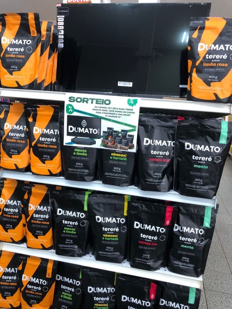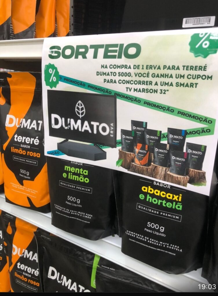 Na compra de um pacote de erva para tereré Dumato 500 gramas, o cliente ganha um cupom para concorrer a uma Smart TV Marson 32 polegadas. A campanha é válida para todos os sabores da linha, oferecendo mais sabor e ainda a chance de levar um prêmio para casa.