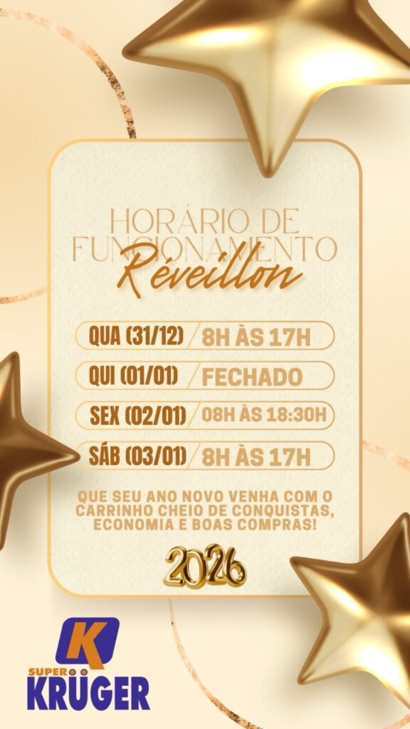 Ao final, a direção e os colaboradores do Super Krüger deixam uma mensagem à comunidade, desejando que 2026 seja um ano de saúde, união, prosperidade e muitas conquistas. A equipe agradece a confiança de cada cliente ao longo de mais um ano e deseja que o novo ano seja repleto de paz, boas escolhas e momentos felizes ao lado de quem se ama. Um feliz 2026 a todos.