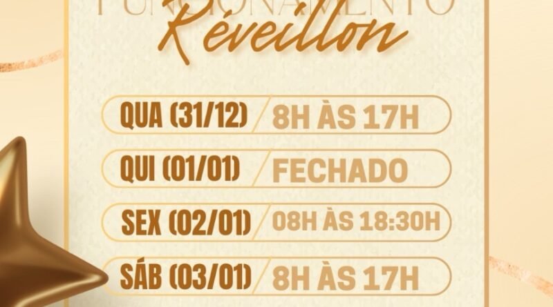 Na quarta-feira, dia 31 de dezembro, o supermercado atende das 8h às 17h. Na quinta-feira, dia 1º de janeiro, não haverá atendimento em razão do feriado de Ano Novo. O funcionamento retorna na sexta-feira, dia 2 de janeiro, das 8h às 18h30, e no sábado, dia 3 de janeiro, das 8h às 17h.