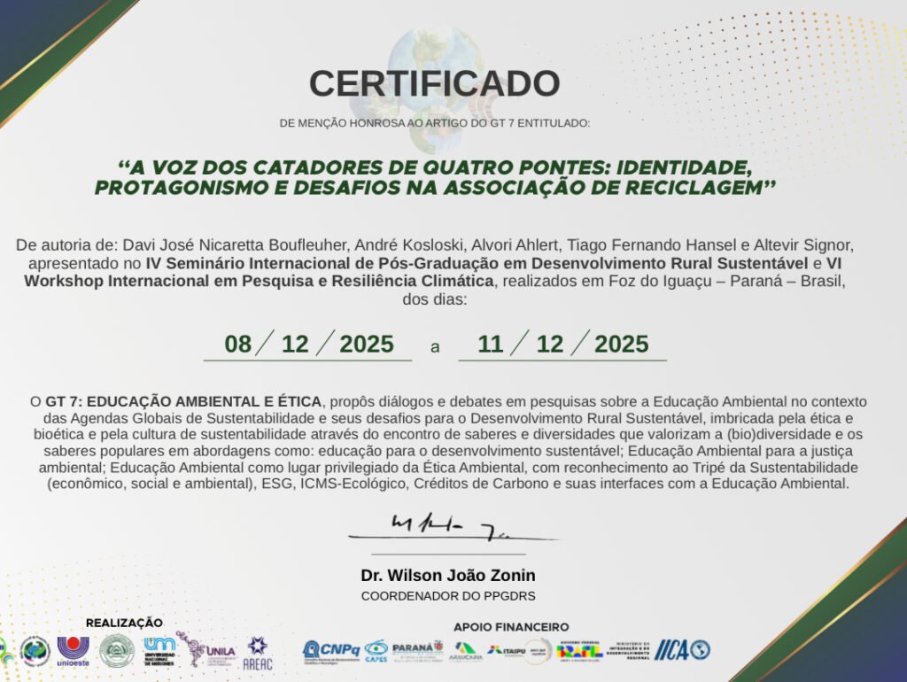 O município tem um motivo especial para se orgulhar. O trabalho acadêmico intitulado “A Voz dos Catadores de Quatro Pontes: identidade, protagonismo e desafios na associação de reciclagem” recebeu Menção Honrosa no Grupo de Trabalho 7 – Educação Ambiental e Ética, durante o IV Seminário Internacional de Pós-Graduação em Desenvolvimento Rural Sustentável e o VI Workshop Internacional em Pesquisa e Resiliência Climática, realizados em Foz do Iguaçu, no Paraná.