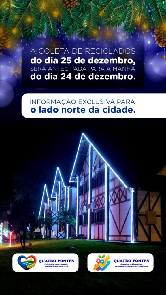 A Unidade de Valorização de Recicláveis (UVR) de Quatro Pontes informa à comunidade que, em razão dos feriados de Natal e Ano Novo, haverá antecipação na coleta de materiais recicláveis no lado norte da cidade nas próximas semanas.