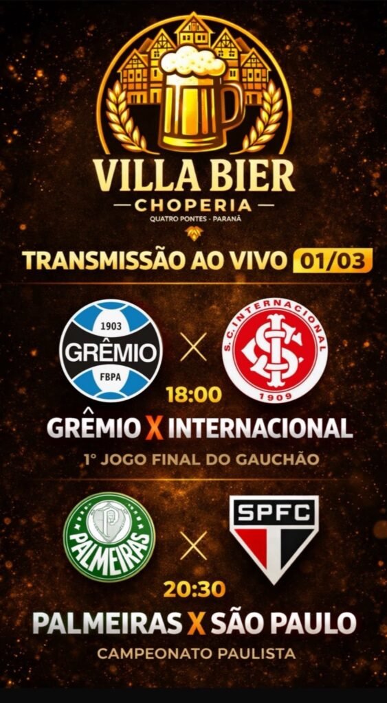 A Villa Bier Choperia, em Quatro Pontes, será novamente ponto de encontro dos amantes do futebol neste domingo, dia 1º de março. A casa preparou uma programação especial com transmissão ao vivo, em telão, de dois grandes confrontos do futebol brasileiro.