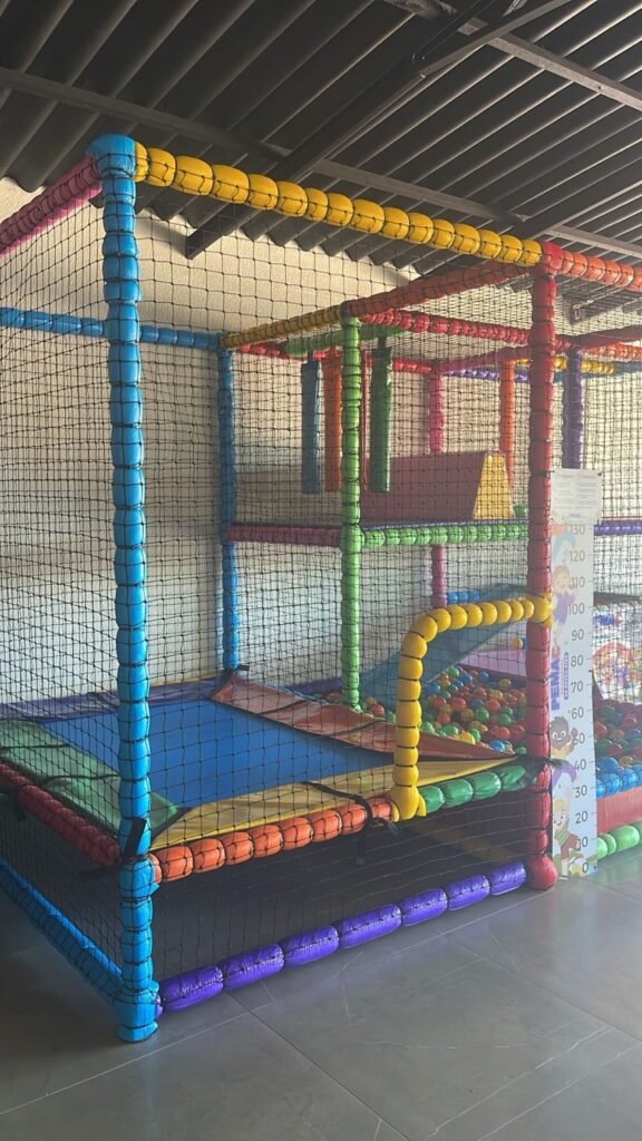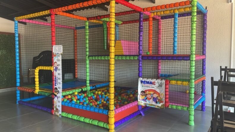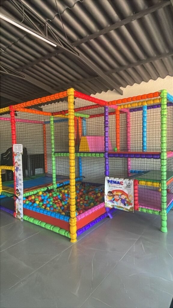 O espaço foi desenvolvido após diversas ideias e projetos, com o objetivo de oferecer um ambiente adequado para os pequenos brincarem. A estrutura conta com brinquedos coloridos, piscina de bolinhas, área para atividades e equipamentos protegidos por redes de segurança, proporcionando tranquilidade para os pais e muita diversão para a criançada.